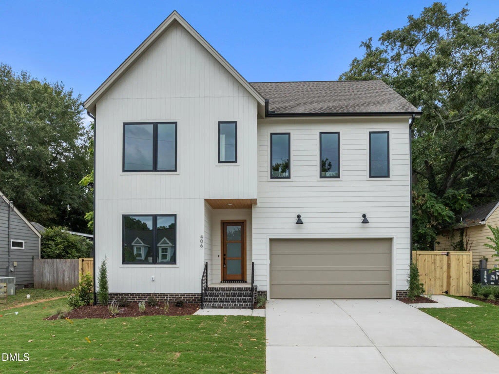 Creating Homes that Revolve Around You! Built by Revolution Homes, this 2025 Parade of Homes entry has 4-bedrooms, 3 baths and offers a light-filled, open layout with designer touches and accents throughout. The kitchen includes black stainless Bosch appliances, natural-tone cabinets and tile backsplash that extend to the ceiling, a custom hood, quartz countertops with waterfall edges on large island, and a spacious pantry. The downstairs guest room can easily be utilized as an office, separate from the main living area, and conveniently accessible to a full bath. Enjoy hardwood floors throughout the main level, staircase, and upstairs hallway. The family room showcases a beautifully accented fireplace flanked by natural-tone built-ins, and a large slider opening onto the screened porch for seamless entertaining and relaxation. Extra highlights include designer lighting and sconces, stylish custom tile in bathrooms, and a custom mudbench with drop zone. Upstairs offers two bedrooms with a shared buddy bath, a spacious rec room with french doors, and a dedicated laundry room. The primary suite includes a double vanity, luxurious shower, and a walk-in closet tailored to your needs. HERO certified with thoughtful energy-efficient features like a sealed crawlspace, tankless water heater, and 2x6 exterior walls deliver comfort and value behind the scenes. With a 2-car garage and quick access to parks, shopping, and downtown Raleigh, this home blends craftsmanship, sustainability, and location in one perfect package! Move-in ready with all appliance needs included.