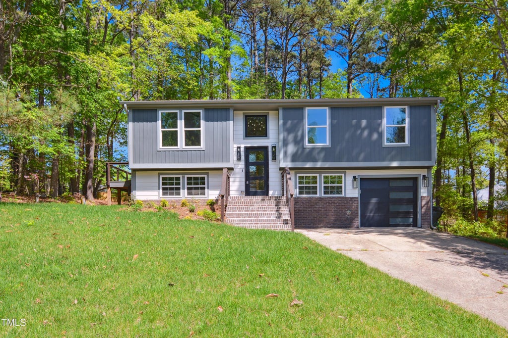 Totally renovated from top to bottom 3 bed 3 bath home in prime North Raleigh location. Luxury vinyl plank floors throughout home. Fresh paint inside and out. New HVAC, roof and windows in 2022. New light & plumbing fixtures. Family room features vaulted ceiling. Separate dining area. Stunning chef's kitchen offers quartz countertops, massive center island, designer tile backsplash, custom cabinets, new stainless steel appliances & farmhouse sink. Primary suite includes completely remodeled bathroom with leathered quartz top dual vanity, oversized tile shower with marble tile walls & floor + dual shower heads & bench. Lower level bonus room in addition to extra bedroom with new ensuite bathroom. 1 car garage. Expansive deck with Trex flooring overlooks nice, wooded backyard.