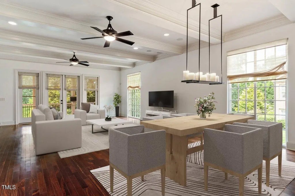In the expansive great room, daylight pours in through 2 oversized windows, and ceiling beams add character and warmth. Acclaimed North Carolina artist Michael Joerling was commissioned to build the buffet in the dining area. A screened deck offers the perfect spot for relaxation and has two ceiling fans and heaters to keep you comfortable.