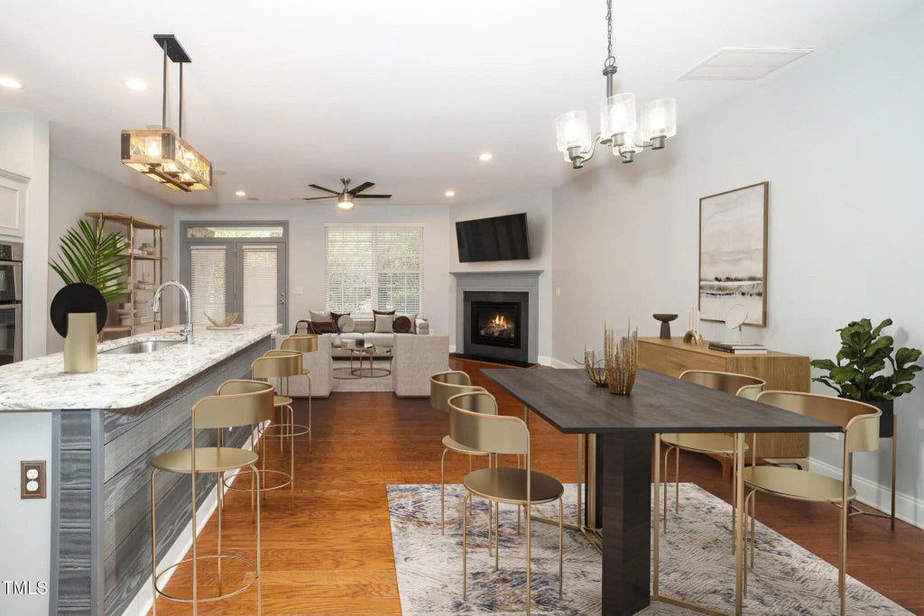 Step inside to an inviting open floor plan featuring gleaming hardwood floors and stylish updated lighting. The kitchen is a cook's delight with a center island, gas cooktop, stainless steel appliances, and a roomy pantry. The spacious family room centers around a cozy gas fireplace, perfect for relaxing nights in or hosting friends. Upstairs, the primary suite boasts a tray ceiling, walk-in closet, and a spa-inspired bath with soaking tub and separate shower. Enjoy the outdoors from your private patio or relax on the charming covered front porch. Plus, the attached 1-car garage adds everyday convenience. Unbeatable location—just minutes to Southpoint Mall, RDU Airport, RTP, and endless shopping and dining options!