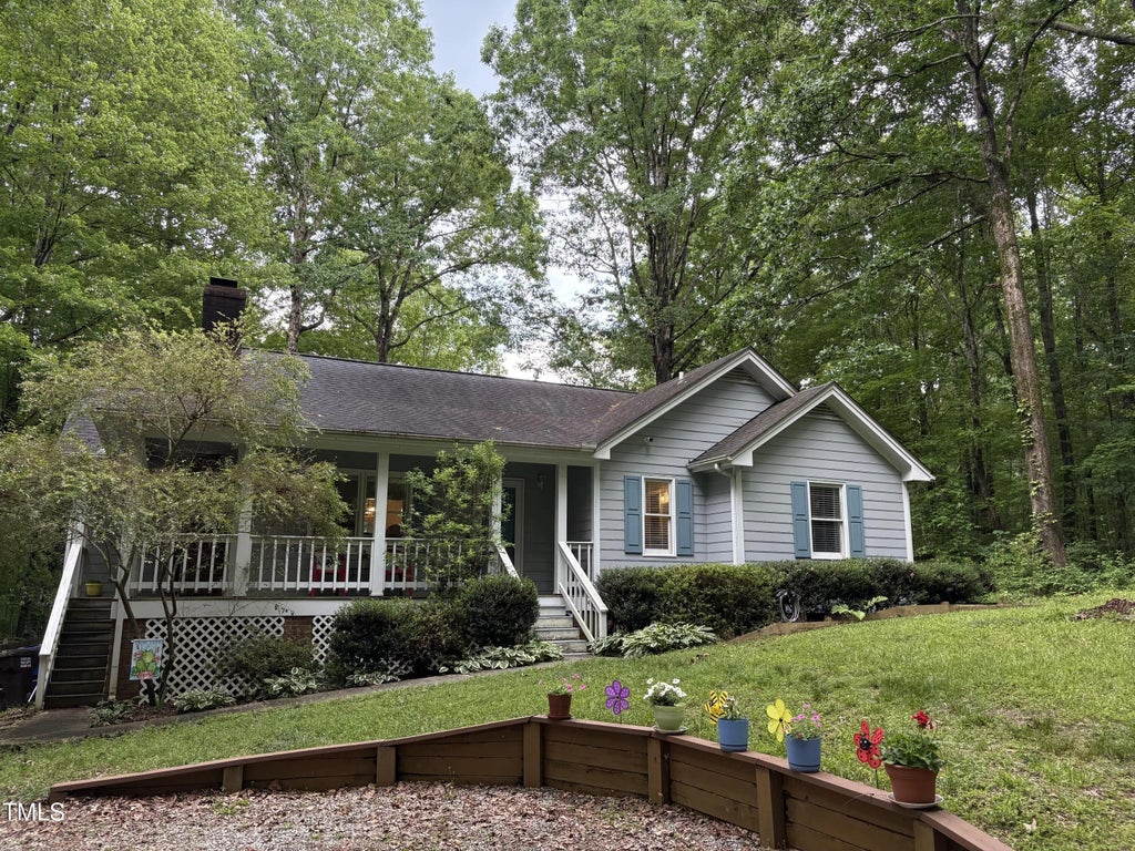 Experience the serenity of a peaceful, private country setting located in a cul de sac with 1.24 acres of woodland nestling this cozy 3 bedroom and 2 bath home in Apex! Put your feet up in the family room by the brick wood burning fireplace while you enjoy the smells coming from the beautiful eat-in kitchen updated with granite countertops, SS gas stove, refrigerator and convenient pantry with pull out shelves. Sleep comfortably in the primary bedroom after experiencing the relaxation of the rainfall shower and heated floors in the en suite. Relax outdoors under the shade of the abundant mature trees or enjoy a summer barbecue on the backyard deck complete with built-in propane attachment lines for your grill. Hardwood floors are consistent throughout the home, complimenting the country vibes. Escape to your tranquil homesite which includes a eufy security doorlock system with convenient phone monitoring while you have no obligation to HOA dues or restrictions and NO city taxes!!! Freshly touched up interior paint! Travel back to the city is a breeze with the 540 Expressway conveniently located 1.5 miles down the road. Back on the market after a change in the previous buyers' needs.