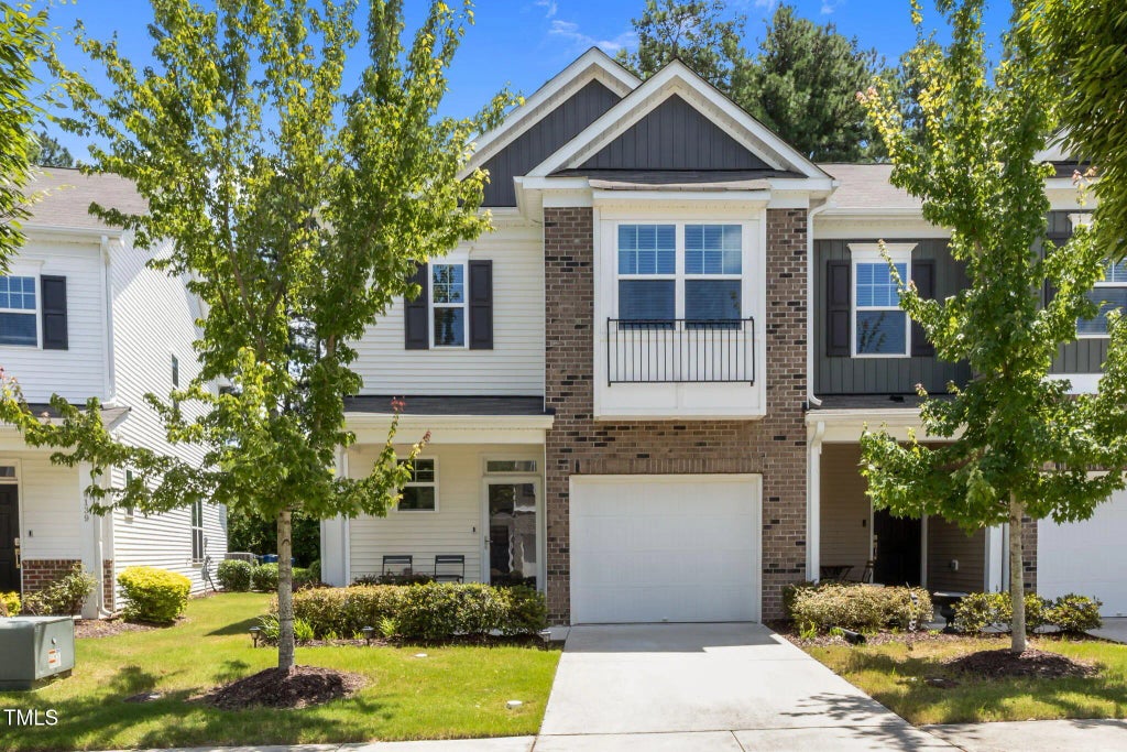 Looking for low-maintenance living with style and space? This bright and beautifully kept end-unit townhome in City Walk might just be the one! You'll love the welcoming covered front porch and all the natural light pouring in. Step inside to find gorgeous LVP flooring throughout the main level and custom trim details that add a touch of charm right from the entry. The kitchen is a total standout—with 42'' staggered cabinets, quartz countertops, a sleek tile backsplash, gas range, and a roomy double-door pantry. It opens right up to a spacious family room where you can cozy up by the corner gas fireplace. Upstairs, the primary suite is seriously impressive—plenty of room to spread out, plus a bathroom with dual sinks, quartz counters, tile floors, and a stylish walk-in shower. Don't miss the walk-in closet! There are two more good-sized bedrooms, a full bath, and a separate laundry room, all on the second floor. Other perks? 9-foot ceilings on both levels, hardwood stairs, a 1-car garage, and access to the neighborhood pool. Out back, enjoy peaceful evenings on your private patio facing the woods. And the location? Super convenient—just minutes to restaurants, shops, and major highways.