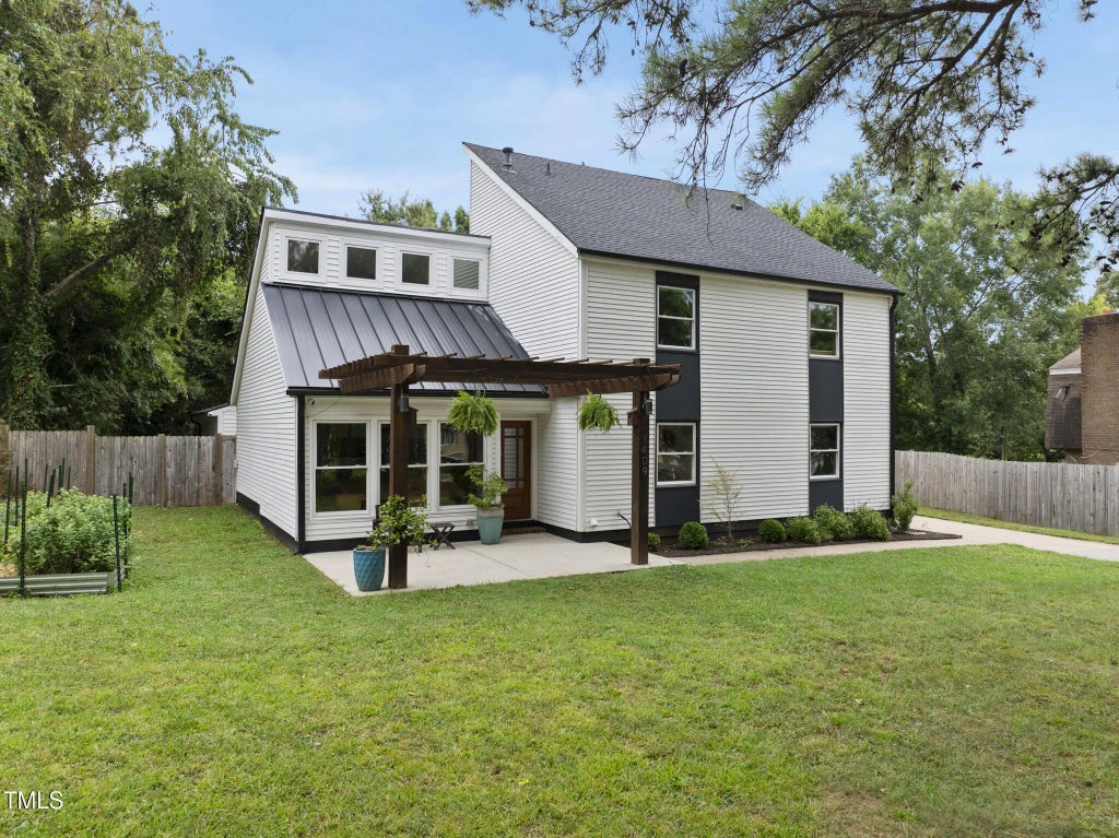 Rare Downtown Raleigh gem with modern flair! Step into a dramatic foyer with soaring ceilings and a retro-inspired sunken living room with a see-through fireplace. Walls of windows flood the open floorplan with natural light. The gourmet kitchen features a waterfall island, single-bowl sink, gas range with hood, classic white cabinetry, and a bold black backsplash. Adjacent breakfast nook, spacious family room, and bonus area offer versatile living options. The main-level primary suite boasts a spa-like bath with large-format tile, dual sinks, and a walk-in closet. Laundry room conveniently located on the first floor. Upstairs includes two generous bedrooms and a full bath. Private patio leads to a 2-car garage. Prime location! Home across the street will begin renovations Fall 2025.