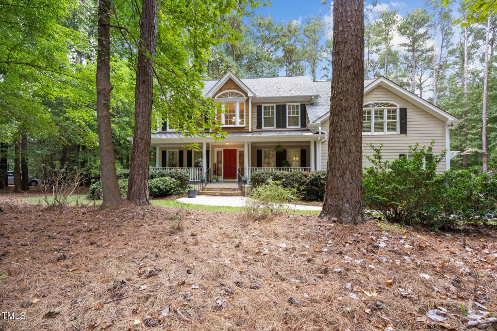 Gorgeous custom home located on private 2 acre lot in gated N. Raleigh community! Grand front porch provides a favorite relaxing spot! 2 Primary Suites-on 1st & 2nd floors; both baths w/heated floors! Curbless zero entry shower in main fl primary ba. Flex room on the 1st fl could be additional br, office or den. Formal dining room w/elegant trim work. Beautiful hardwoods throughout main flr! Vaulted ceiling & stone fireplace highlight spacious family rm. Chef's kitchen features center island, stainless appliances, tile backsplash, butler's pantry & granite countertops. Upstairs primary br suite provides a perfect retreat w/relaxing soaking tub. 3 additional bedrooms, full ba & large bonus rm round out the 2nd fl. Rear covered porch, patio & pergola for outdoor living. Additional features: Fenced garden area, irrigation system, tankless water heater, encapsulated crawlspace, underground dog fence, storage shed & water softener.