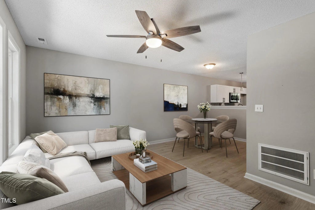 Adorable 2 bedroom Townhouse in Prime Raleigh location - minutes from Downtown Raleigh and NC State campus. Bright open custom kitchen features granite counters, tile backsplash and stainless steel appliances. Wide plank laminate hardwood flooring through main living areas; PLUSH new carpet. New water heater 2025. Staged photos for illustration only, to show homes potential.