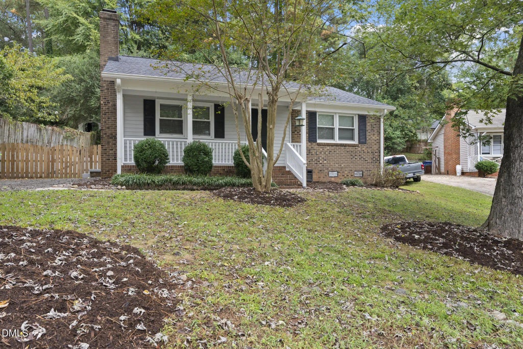 Welcome home to this charming retreat tucked in a quiet cul-de-sac, ideally located just minutes from North Hills, shopping, dining, and city conveniences. Inside you'll find a bright, welcoming kitchen with tile backsplash, a cozy living room with fireplace, and a primary suite with two closets. The backyard offers privacy for pets, play, or weekend gatherings, while the front porch is perfect for morning coffee or evening relaxation. A home that balances comfort and convenience in one of Raleigh's most connected locations. New windows 2020, New Roof 2020, New Hvac 2025